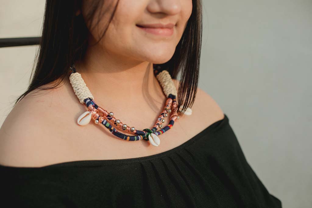 This stylish bohemian necklace brings out the perfect union of mixed medium in Jewellery. The blue cords represent the skies, the white faux leather the clouds, the seashells the waves.