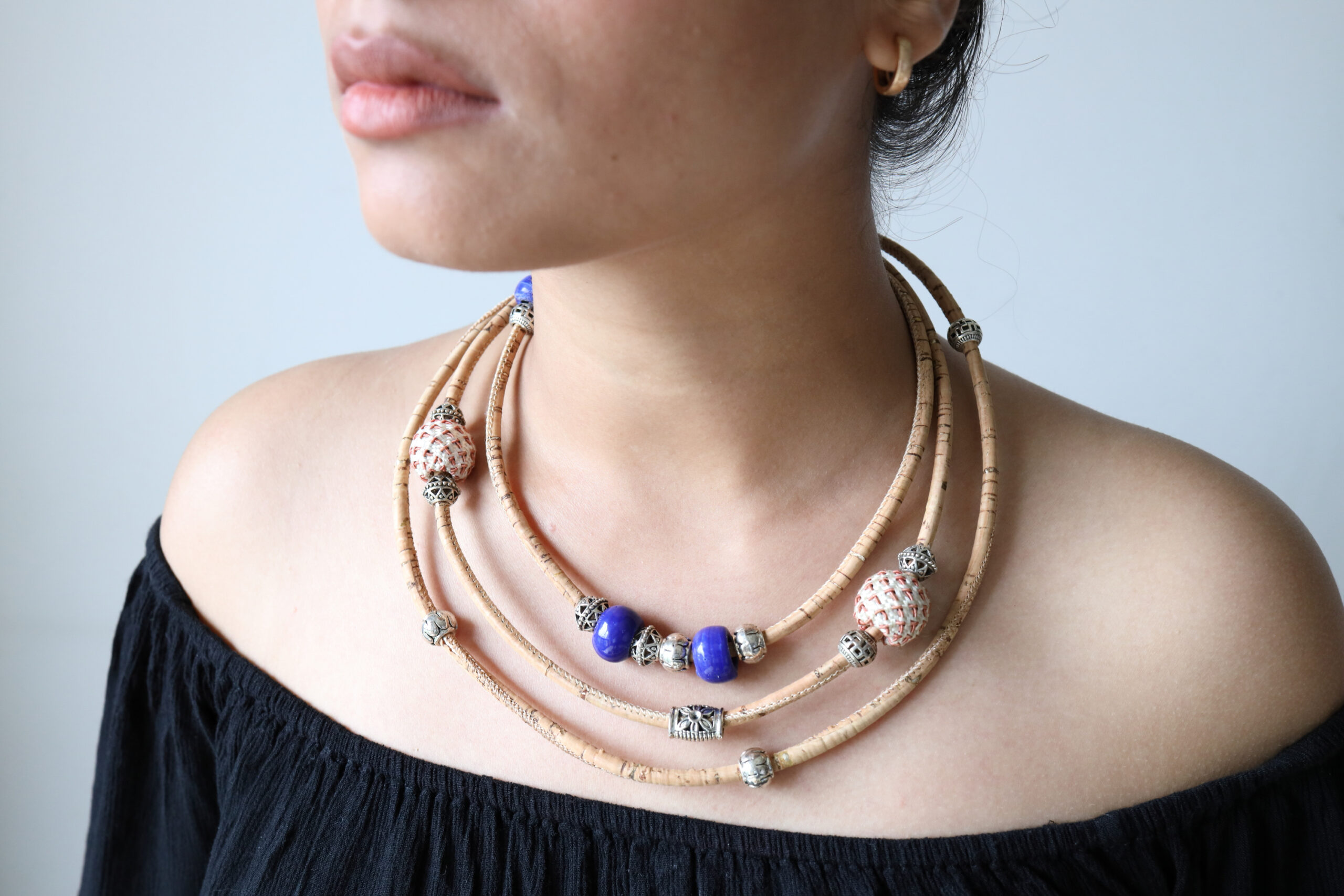 Neutral tones of the natural cork cords sets the mode for an earthly embrance. Woven and ceramic beads, filigree design metals