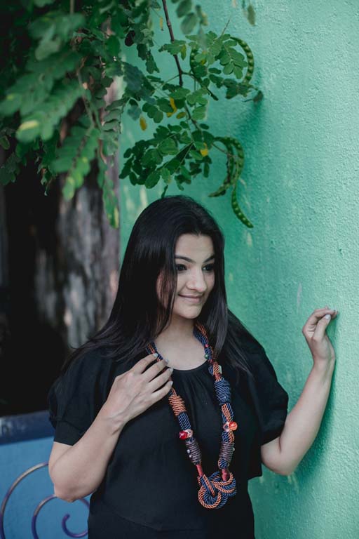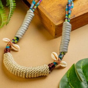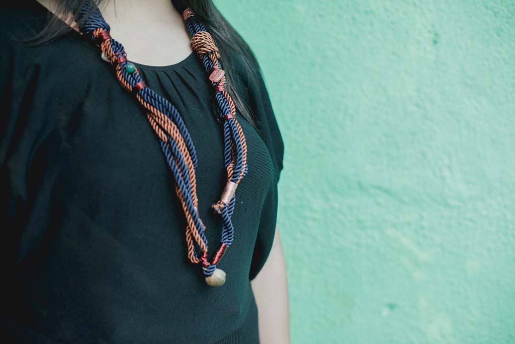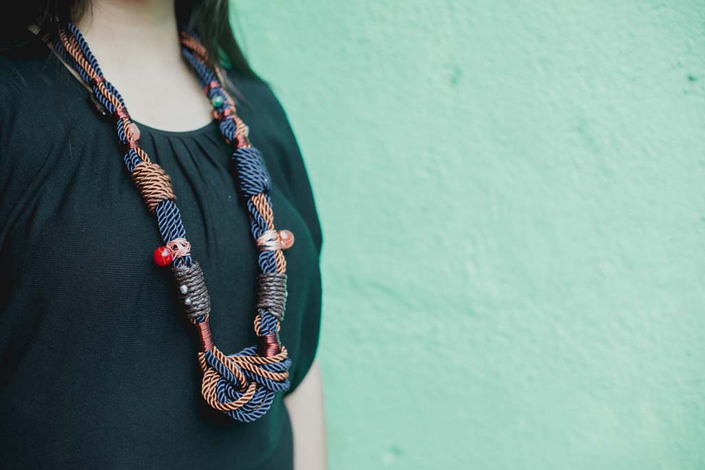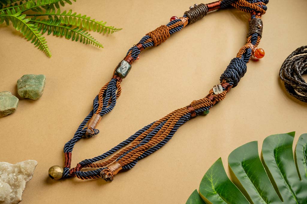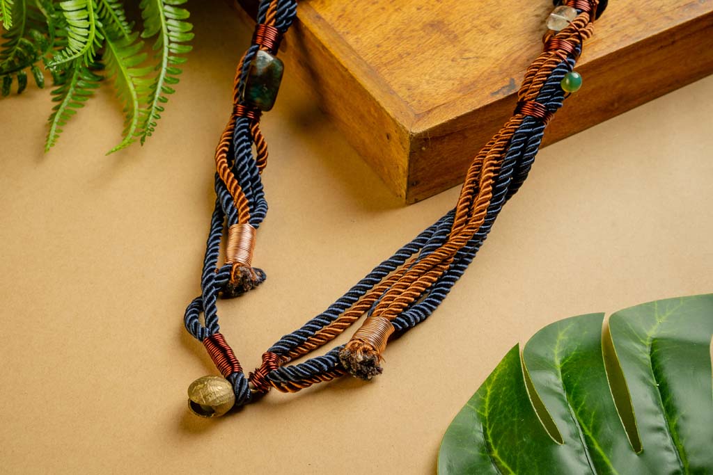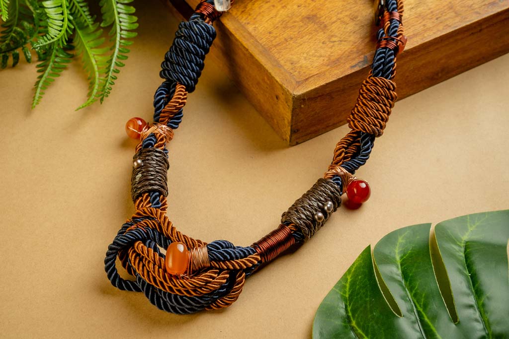 A knotty delight, this necklace is Earthly Browns and Rich Deep Blue entwined is an earthy choice while staying chic. Pop of orange with dual tone wires in copper and red enhances the visual delight. A great accessory for a wide variety of apparel. Fashion Tip: Denim in your ensemble together with this neckpiece, would elevate your look.