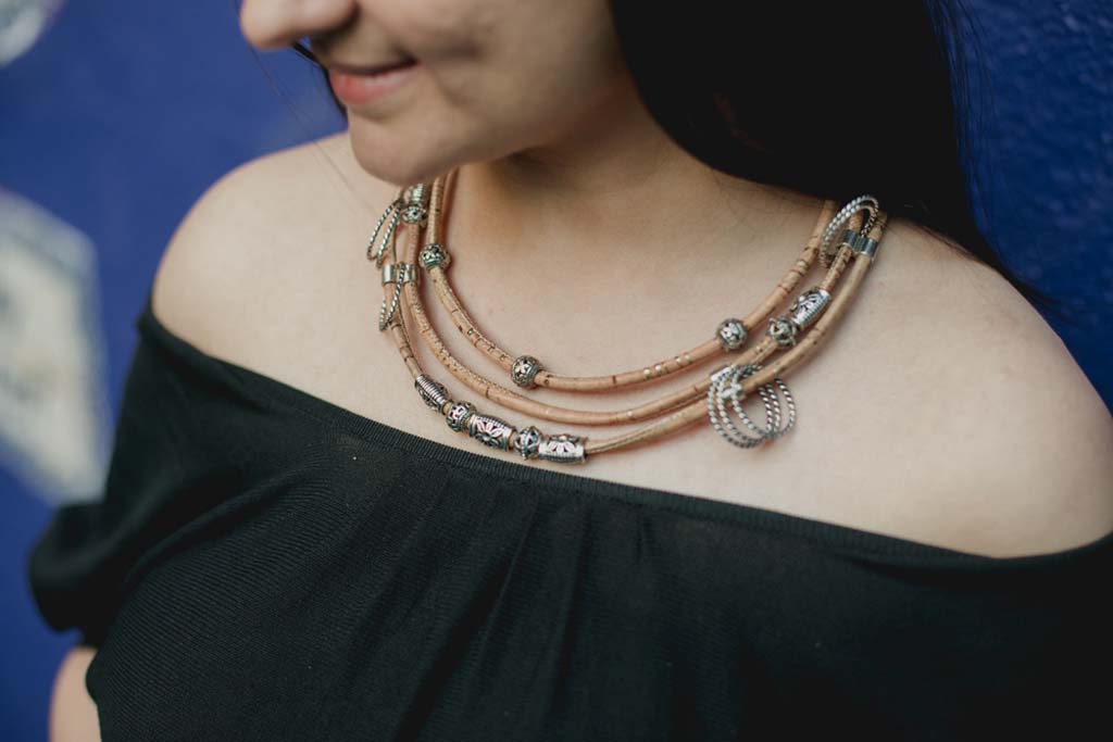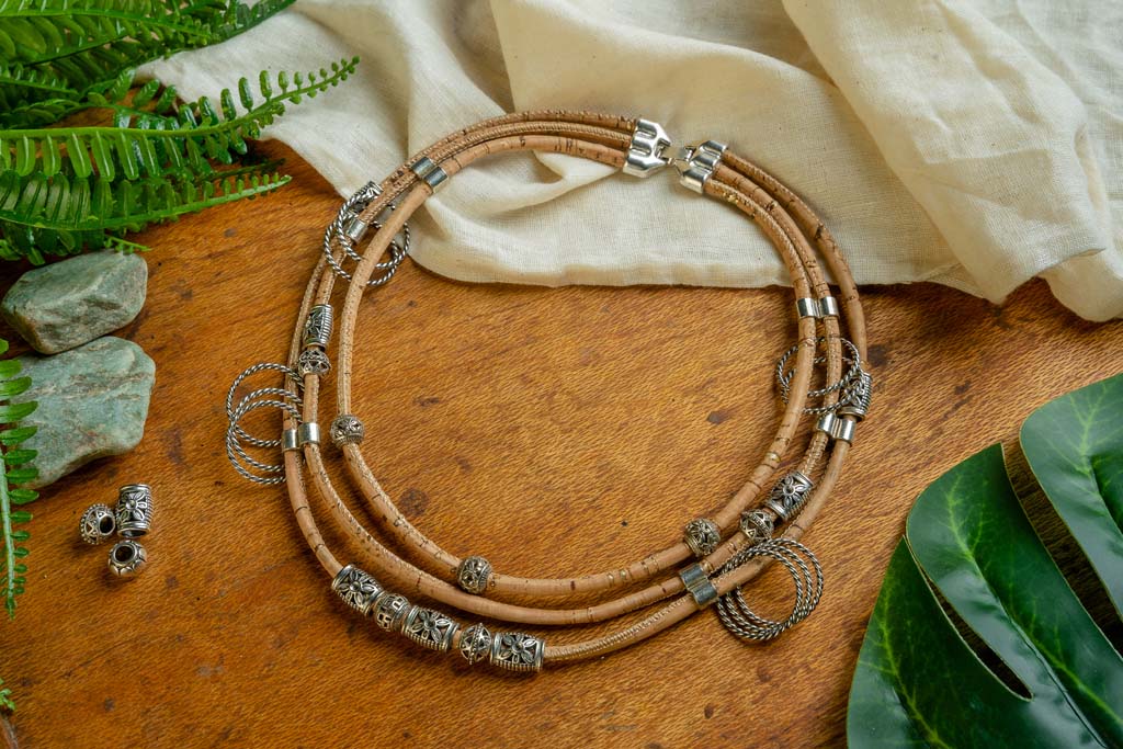 Love is a Ring and a Ring has no ends. An amalgamation of rings and natural plant based cords also known as Cork Cords with Tibetan style spaces. Cork is a unique element in accessorizing and the combination with metal makes an elegant combination. Cork is natural, renewable, and is an attractive alternative to leather. Cork leather is environmentally and ecologically friendly.