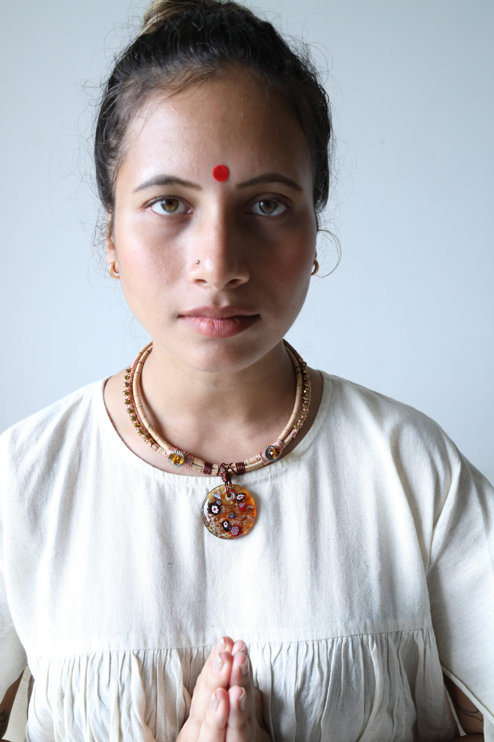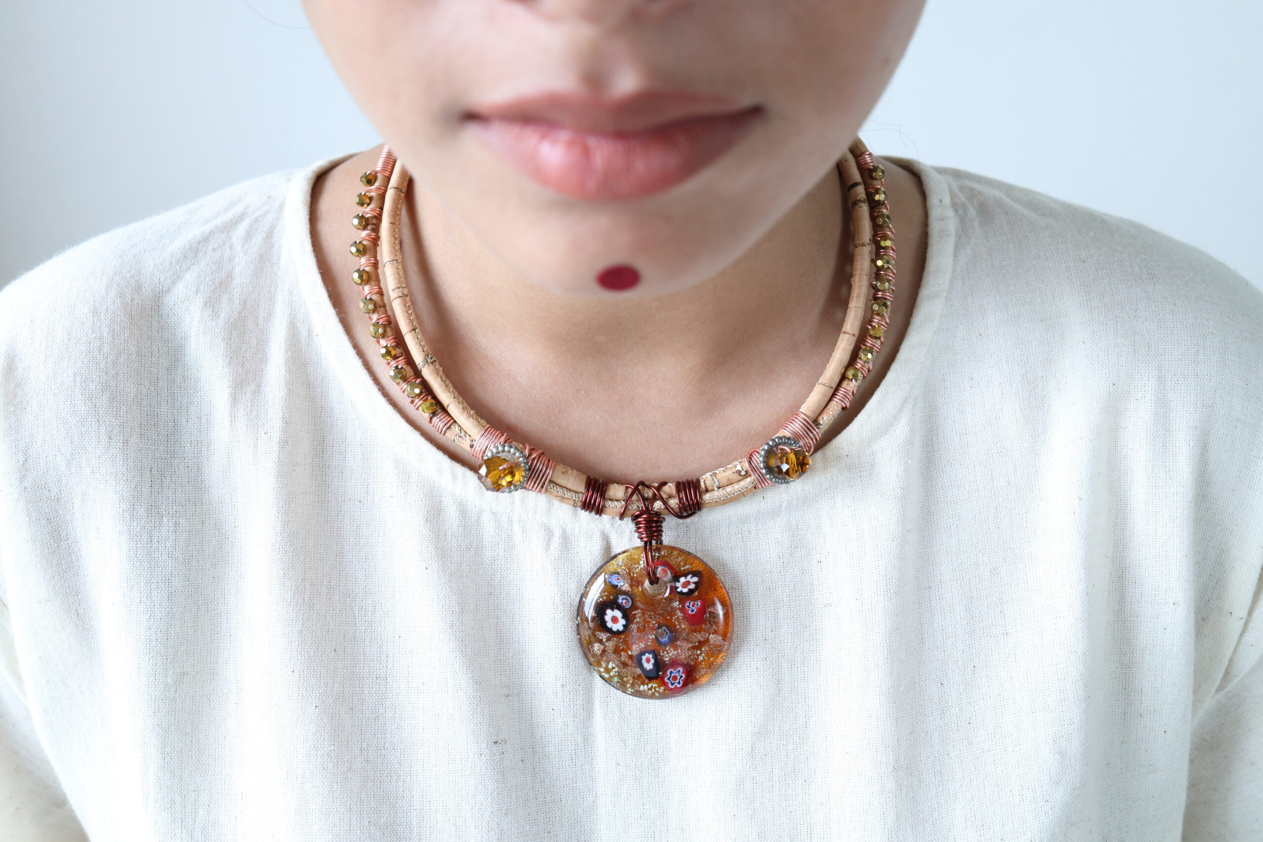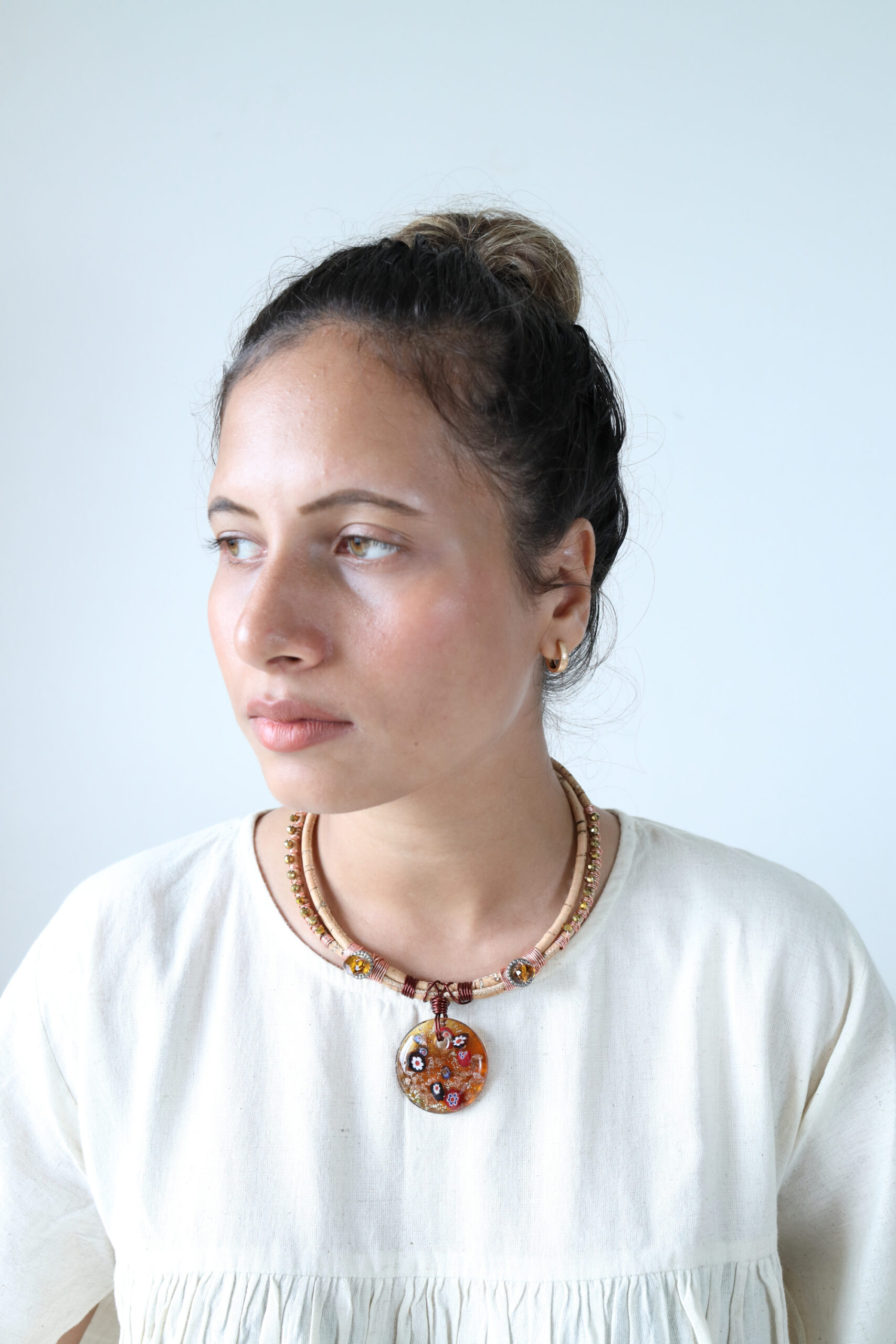 A focal Murano glass pendant rests in the center. A combination of crystal, brass beads, wires in two different tones are brought together to compose flashes of vibrant color and texture.
