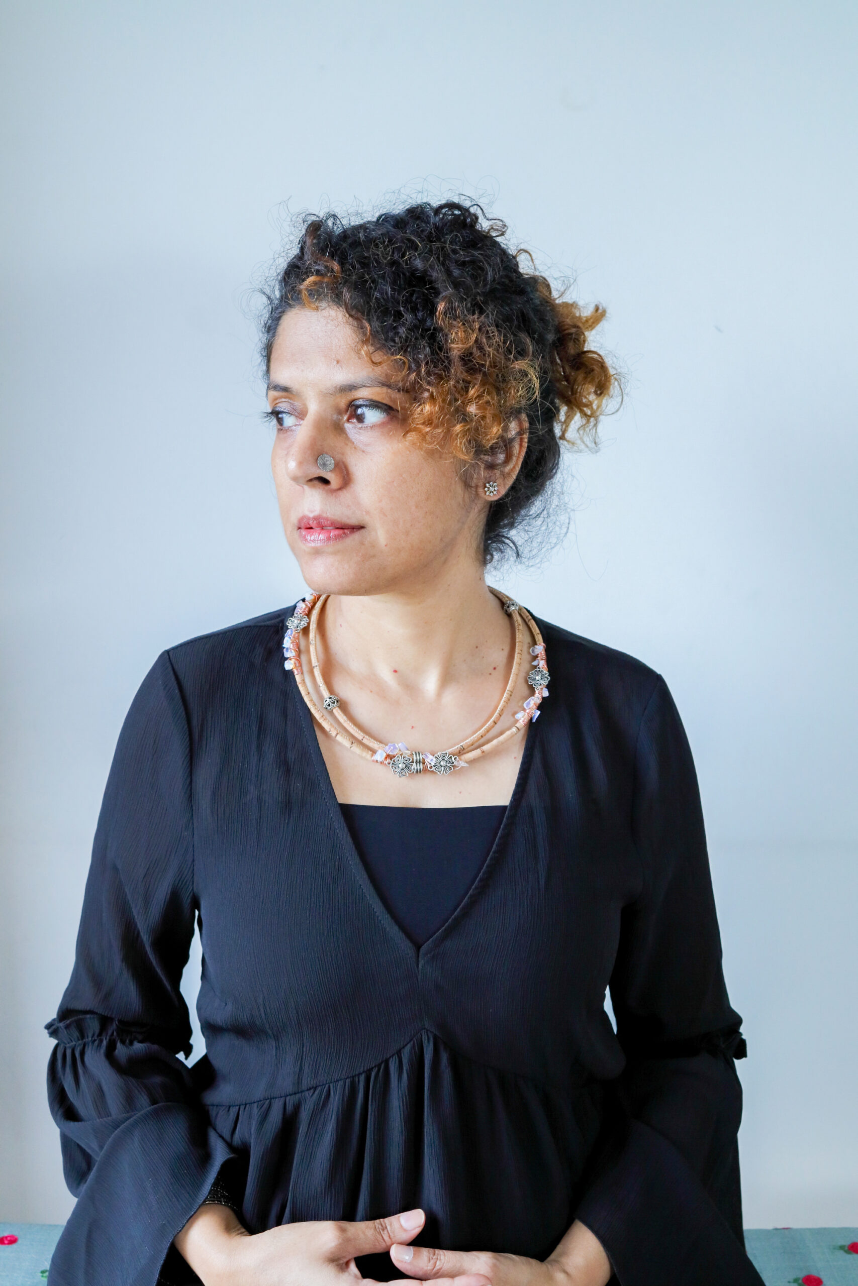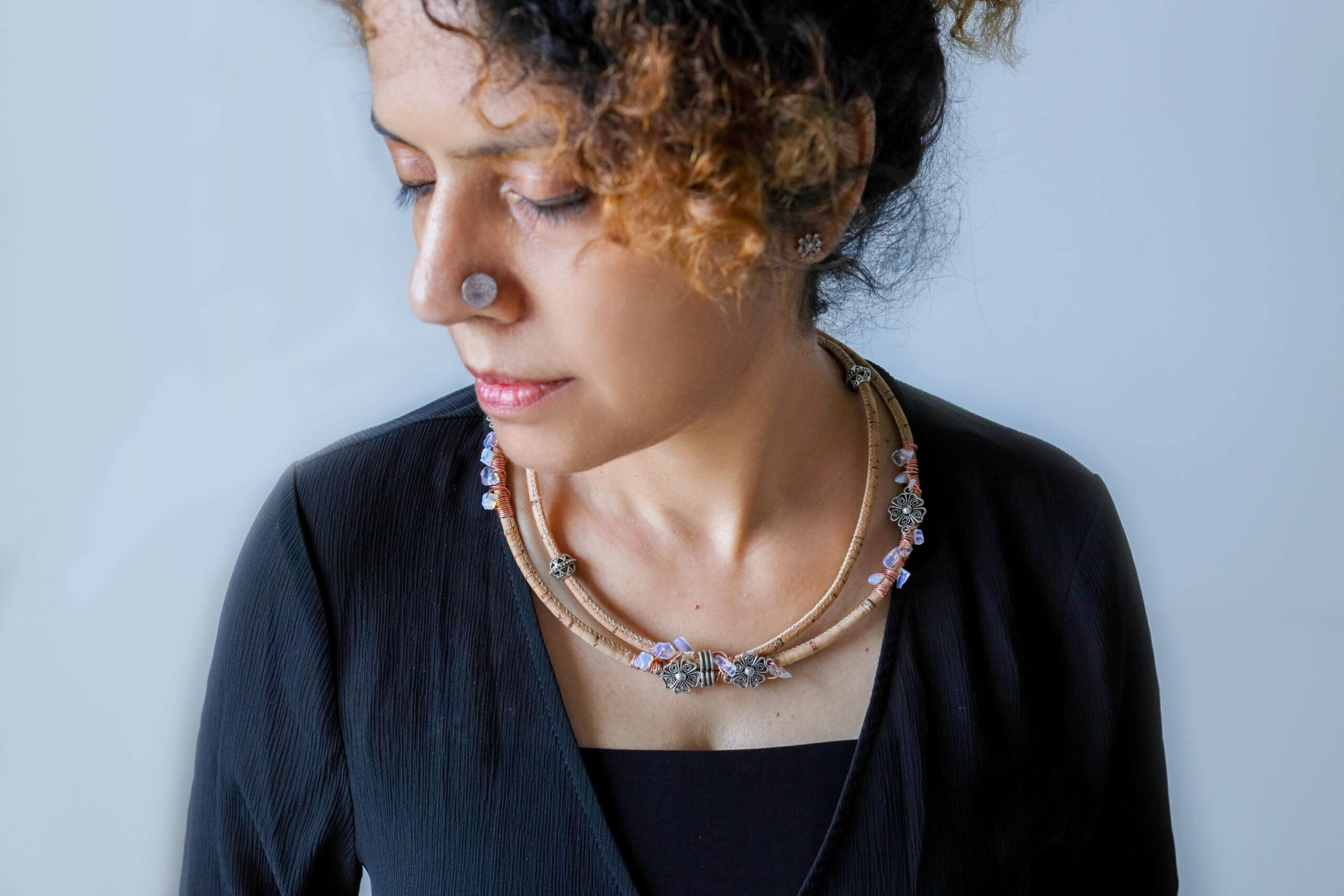 Sweet eternal florals with delicate chips makes elegant neckwear. Natural cork is sustainable and fashionable.
